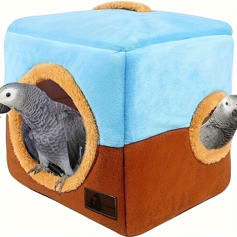 Cozy Foldable Double-Hole Bird Nest – Warm Polyester Hanging Birdhouse with Perch & Swing for Parrots & Small Birds (Blue & Brown)