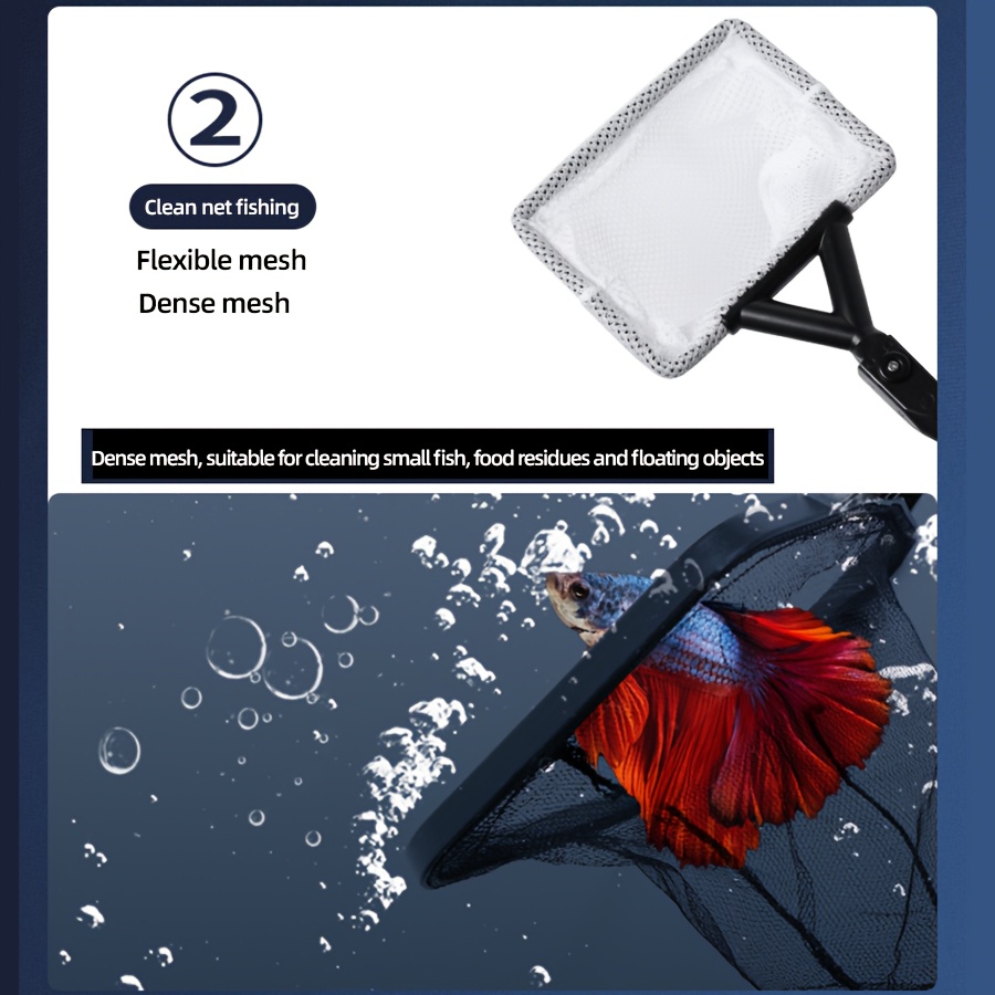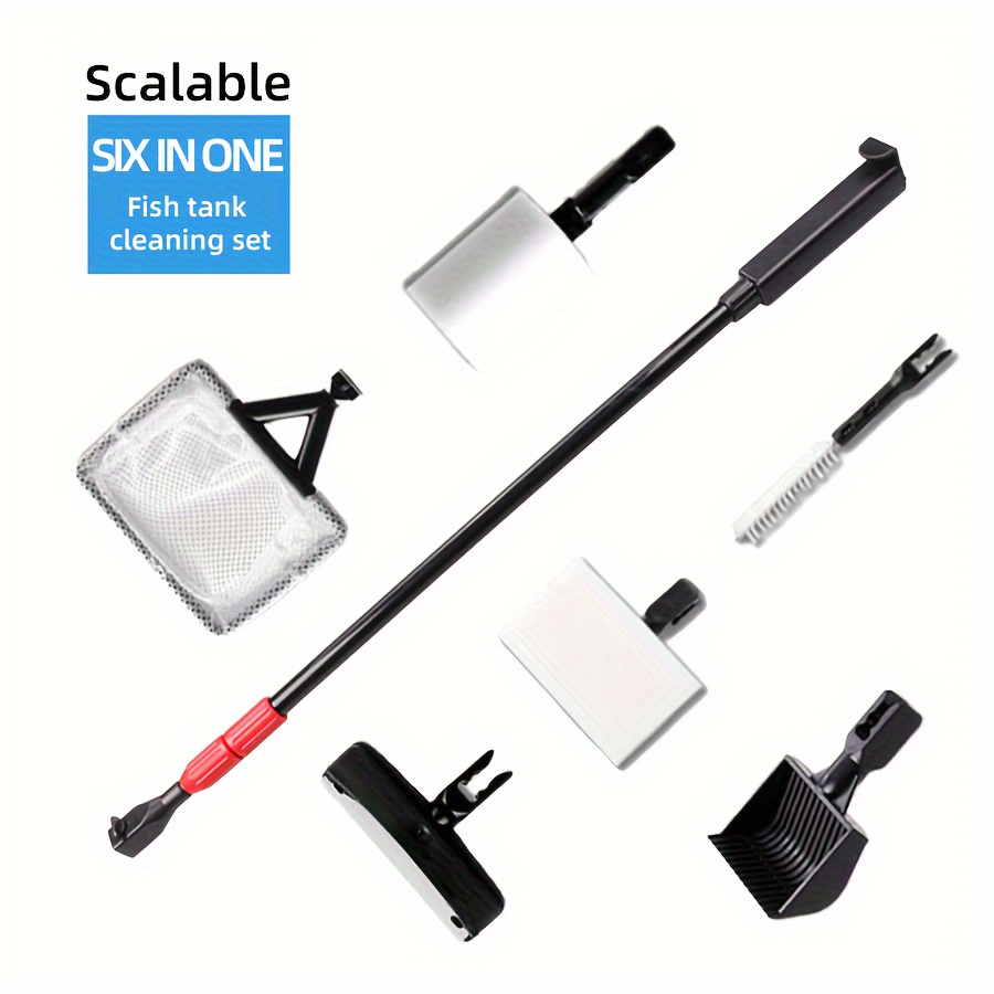 🎁 What’s Included: – 1x 6-in-1 Aquarium Cleaning Kit, featuring a fish net, algae scraper, substrate scoop, pipe cleaner, angled brush, and extendable handle.
