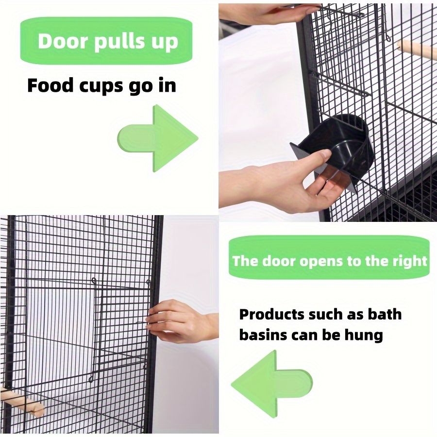 The cage comes with built-in feeders and a water cup, providing easy access to food and hydration. These feeders are designed to be mess-free, so your parrot can enjoy its meals without scattering food around. The water cup ensures that your pet always has a fresh supply of water to stay hydrated.