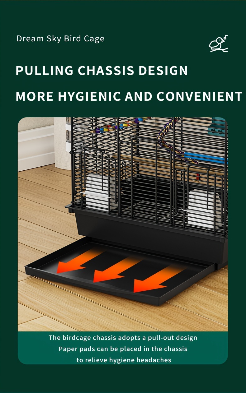 The pull-out tray system makes cleaning a breeze. Simply slide out the tray, clean it, and slide it back in. The easy-to-clean design allows you to spend more time with your bird and less time on upkeep.